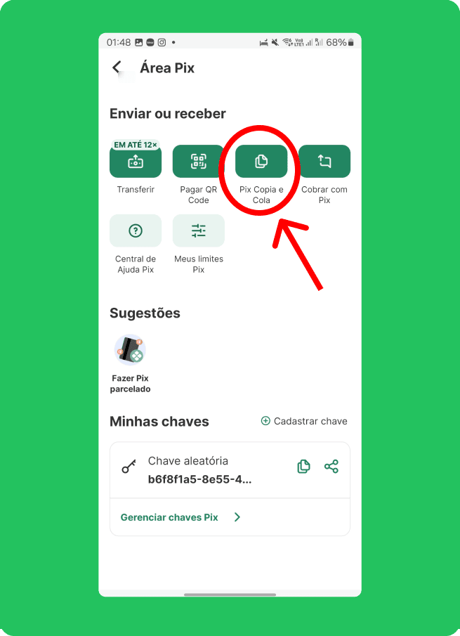 Abra seu aplicativo do Mercado Pago e selecione a opção "Área PIX".